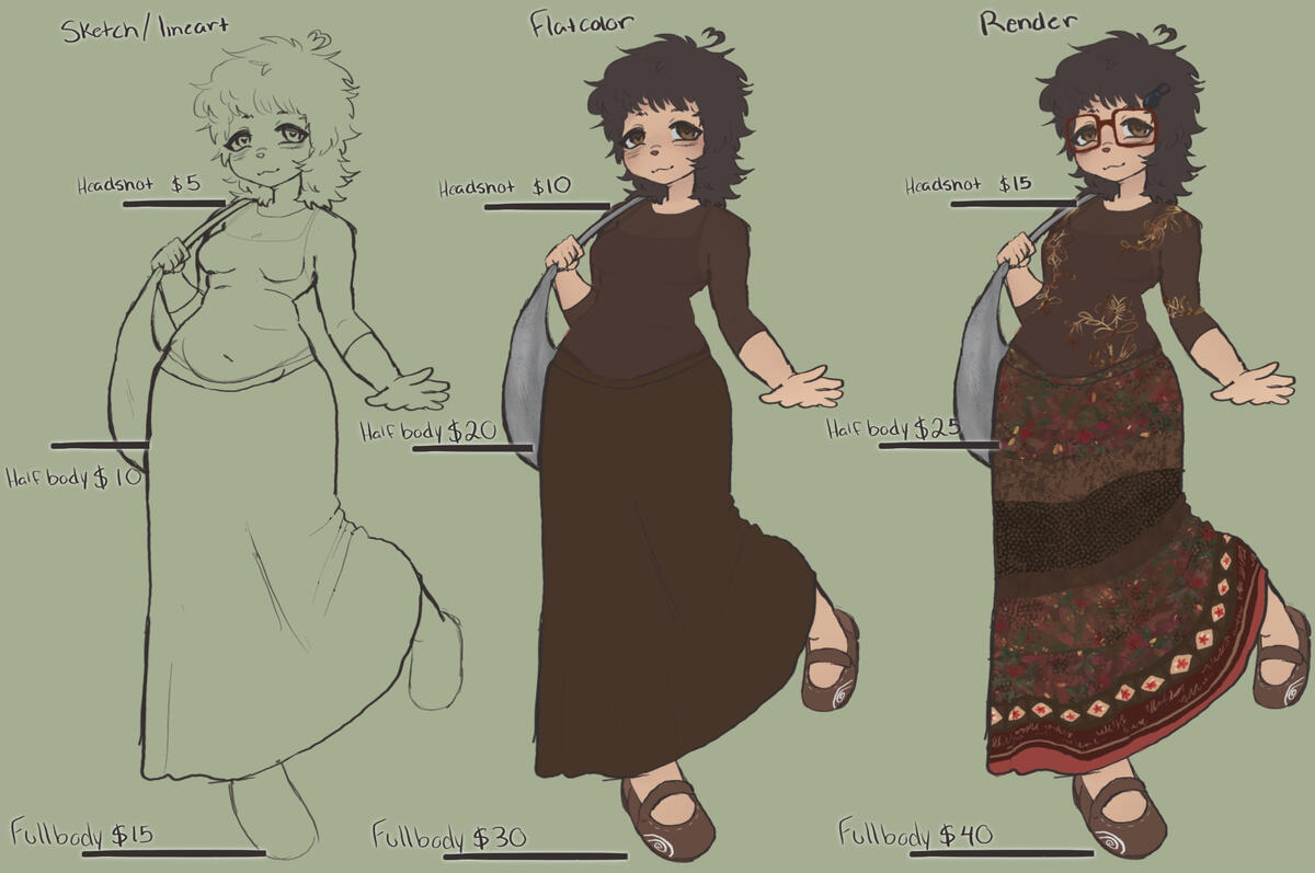 Prices may vary on rendered full body pieces due to complexityPayments will be taken through Paypal, Cashapp, and Kofi